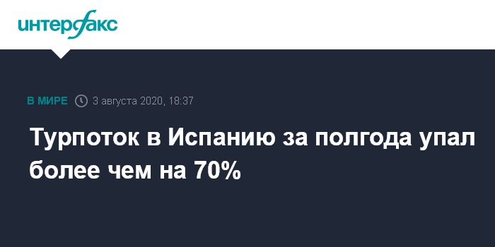 С января по июнь Испанию посетило 10,8 млн зарубежных путешественников, что на 71,7% меньше, чем за аналогичный период годом ранее. Больше всего туристов прибыло из Великобритании (2 млн, минус 75,5%), Франции (1,4 млн, минус 69,8%) и Германии (1,3 млн, минус 74,7%).