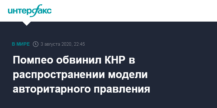 Москва. 3 августа. INTERFAX.RU - Госсекретарь США Майкл Помпео в понедельник обвинил Китай в попытках распространения в мире модели авторитарного правления.