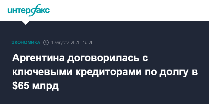 Москва. 4 августа. INTERFAX.RU - Правительство Аргентины договорилось с тремя ключевыми группами кредиторов страны об условиях реструктуризации госдолга на общую сумму $65 млрд.
