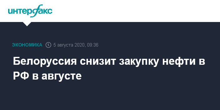 Ранее также сообщалось, что российские нефтяные компании в январе-июле 2020 года поставили в Белоруссию 6,14 млн тонн нефти, что на 37,4% меньше, чем в январе-июле 2019 года.