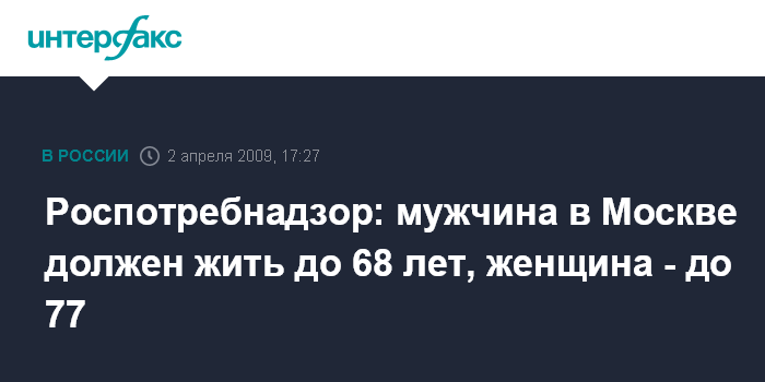 Роспотребнадзор: мужчина в Москве должен жить до 68 лет, женщина - до 77