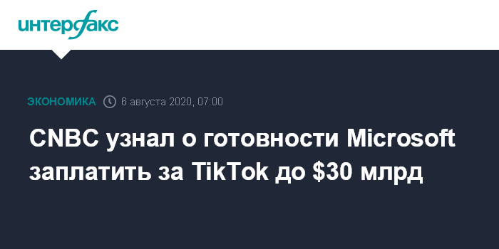 Москва. 6 августа. INTERFAX.RU - Американская компания Microsoft на переговорах с китайской ByteDance о продаже принадлежащего ей приложения TikTok обсуждают сумму сделки в диапазоне от $10 млрд до $30 млрд, сообщает американский телеканал CNBC.