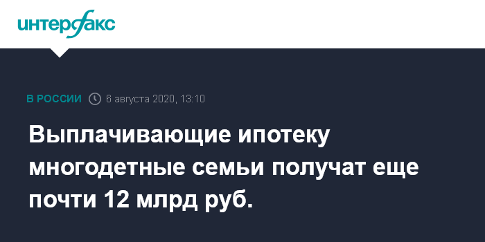 Москва. 6 августа. INTERFAX.RU - Правительство РФ выделяет дополнительно порядка 12 млрд рублей на поддержку многодетных семей, выплачивающих ипотечные кредиты.