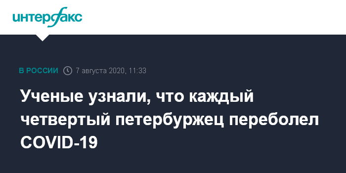 Москва. 7 августа. INTERFAX.RU - Не менее четверти населения Санкт-Петербурга имеет антитела к COVID-19, полученные после перенесенного заболевания, сообщил в пятницу "Интерфаксу" директор Научно-исследовательского института микробиологии и эпидемиологии имени Пастера Арег Тотолян.