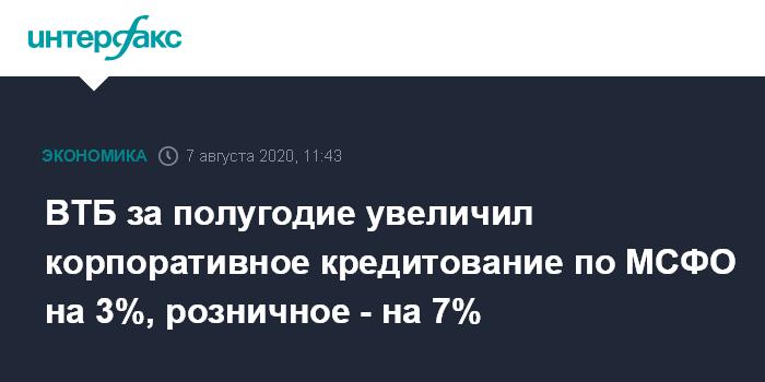 ВТБ за полугодие увеличил корпоративное кредитование по МСФО на 3%, розничное - на 7%