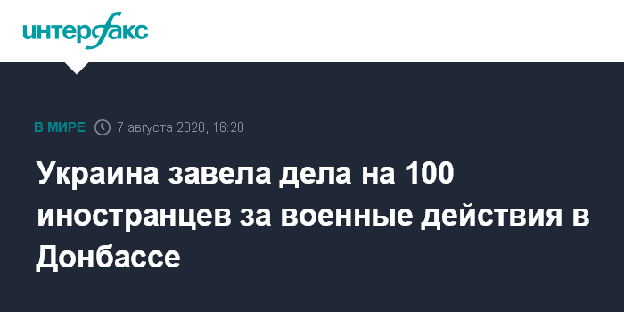 Москва. 7 августа. INTERFAX.RU - Прокуроры Департамента надзора в отношении совершенных в условиях вооруженного конфликта преступлений Офиса генерального прокурора Украины начали уголовные производства по фактам участия более 100 иностранных наемников в вооруженном конфликте против Украины в составе незаконных вооруженных формирований, сообщается на сайте Офиса генпрокурора в пятницу.