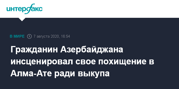 Москва. 7 августа. INTERFAX.RU - Гражданин Азербайджана подозревается в инсценировке собственного похищения в Алма-Ате, сообщила пресс-служба МВД Казахстана.