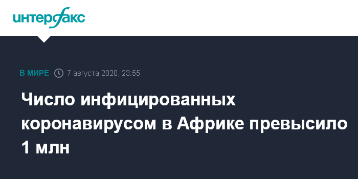Москва. 7 августа. INTERFAX.RU - Количество подтвержденных случаев заражения коронавирусом в странах Африки превысило порог в 1 млн, что составляет 5% от общего числа заражений по всему миру, сообщает Bloomberg со ссылкой на данные африканских центров по контролю и профилактике заболеваний.