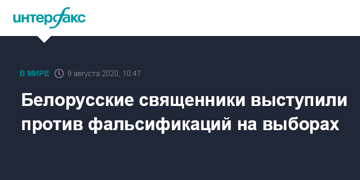 Москва. 9 августа. INTERFAX.RU - Некоторые православные священники присоединились к флешмобу против фальсификаций на президентских выборах в Белоруссии, сообщило в воскресенье "Радио Свобода".