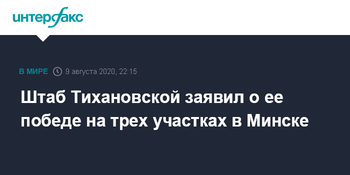Москва. 9 августа. INTERFAX.RU - Штаб кандидата в президенты Белоруссии Светланы Тихановской заявил о ее победе над действующим президентом Александром Лукашенко на трех участках в Минске.