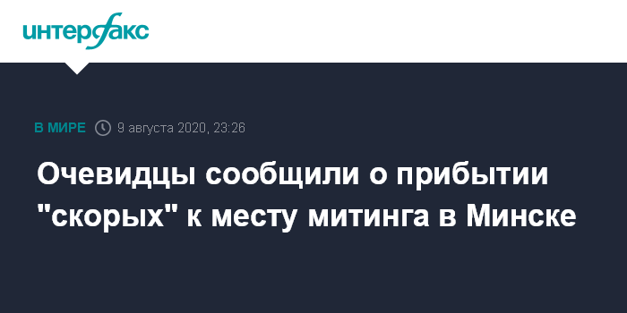 Москва. 9 августа. INTERFAX.RU - Очевидцы сообщают о прибытии большого числа карет скорой медицинской помощи к месту стихийного митинга в центре Минска.