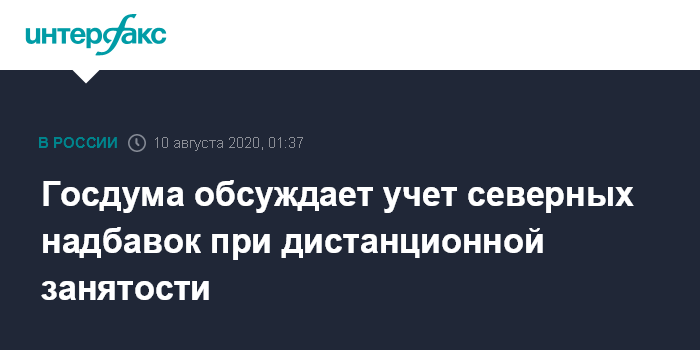 Москва. 10 августа. INTERFAX.RU - Выплату северных надбавок, порой достигающих до 100% от зарплаты, могут распространить и на удаленно работающих сотрудников, этот вопрос сейчас обсуждает группа депутатов, которая заканчивает подготовку законопроекта о дистанционной занятости, сообщает в понедельник газета "Известия".