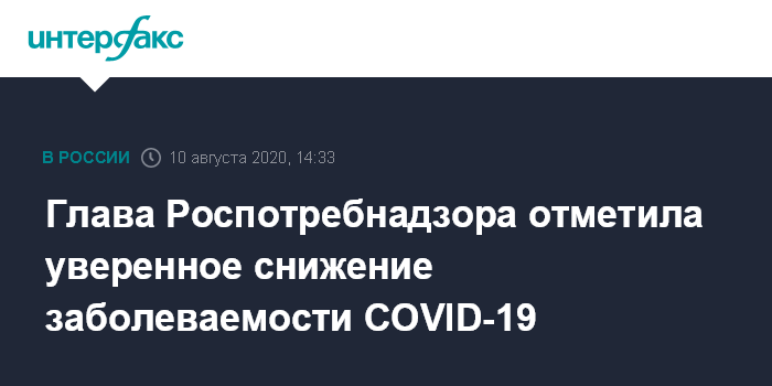 Москва. 10 августа. INTERFAX.RU - Глава Роспотребнадзора Анна Попова заявила, что в России заболеваемость коронавирусной инфекцией устойчиво снижается, ежесуточное число новых выявленных случаем уменьшается. Она сказала это на заседании президиума координационного совета по борьбе с коронавирусом.