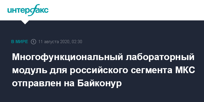 Москва. 10 августа. INTERFAX.RU - Многофункциональный лабораторный модуль (МЛМ) "Наука" железнодорожным составом отправлен из московского Центра Хруничева на космодром Байконур для подготовки к запуску к Международной космической станции (МКС) в 2021 году, сообщает "Роскосмос".
