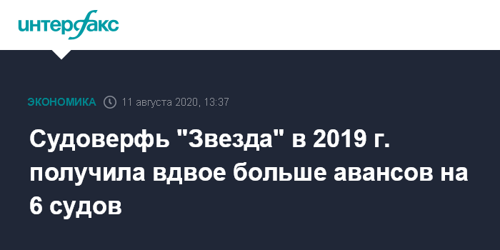 Москва. 11 августа. INTERFAX.RU - АО "Дальневосточный завод "Звезда" (на его базе строится судостроительный комплекс "Звезда") в 2019 году, как и в предыдущем, получило заказы на строительство 6 судов, следует из отчетности компании.