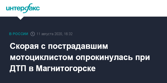 Москва. 11 августа. INTERFAX.RU - Автомобиль скорой помощи, доставлявший на госпитализацию пострадавшего в аварии мотоциклиста, попала в ДТП в Магнитогорске в Челябинской области, есть пострадавшие. Об этом сообщили агентству "Интерфакс" в пресс-службе регионального Минздрава во вторник.