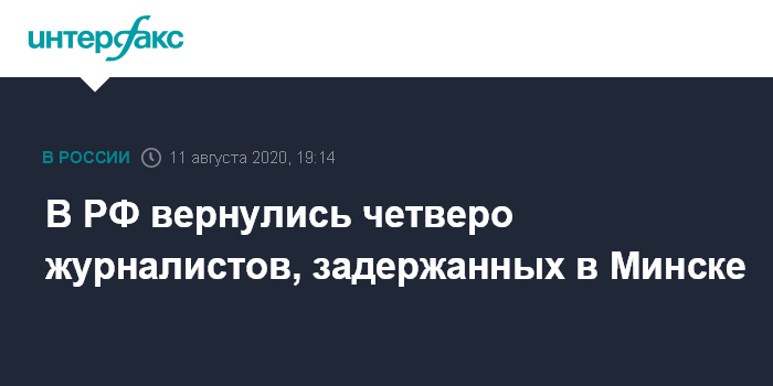 Москва. 11 августа. INTERFAX.RU - Четверо российских журналистов, задержанных в Минске в ходе освещения протестных акций в ночь на 10 августа, вернулись на родину, сообщило издание Daily Storm.
