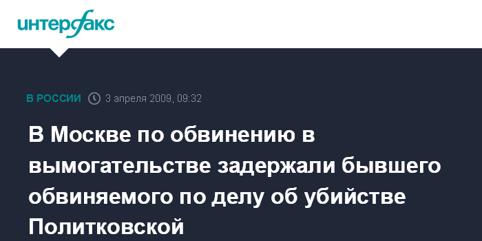 Москва. 3 апреля. INTERFAX.RU - Один из бывших обвиняемых по уголовному делу об убийстве обозревателя "Новой газеты" Анны Политковской задержан в Москве по подозрению в вымогательстве.