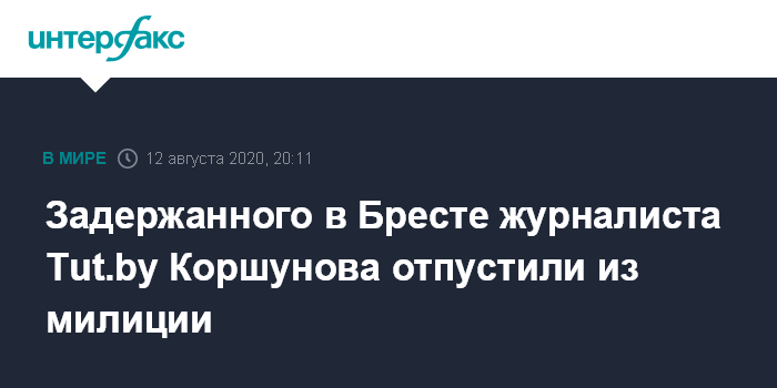 Москва. 12 августа. INTERFAX.RU - Корреспондента портала Tut.by в Бресте отпустили. При задержании он был в жилете СМИ, однако его избили, а технику изъяли.