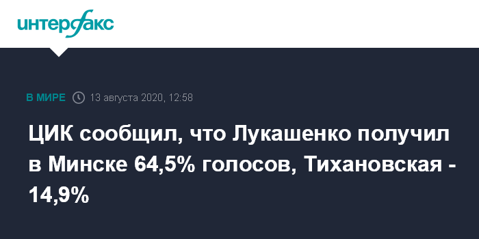 ЦИК сообщил, что Лукашенко получил в Минске 64,5% голосов, Тихановская - 14,9%