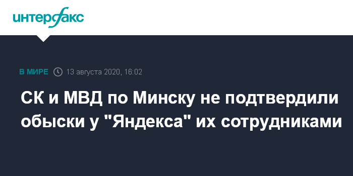 Москва. 13 августа. INTERFAX.RU - В управлении Следственного комитета Белоруссии по Минску, в ГУВД Мингорисполкома и Комитете госконтроля Белоруссии отрицают, что обыски в минских офисах компании "Яндекс" проводят их сотрудники.