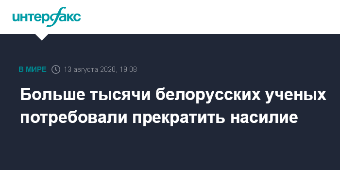 Москва. 13 августа. INTERFAX.RU -Более тысячи белорусских ученых и преподавателей подписали обращение к властям с требованием прекратить насилие в отношении демонстрантов и освободить задержанных в ходе протестных акций. Обращение опубликовало издание "Onliner.by".