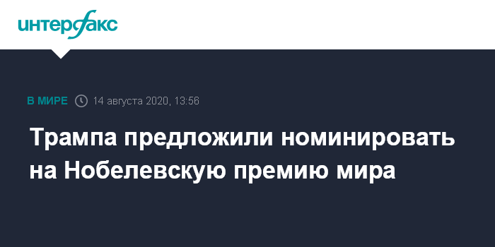 Москва. 14 августа. INTERFAX.RU - Советник президента США по нацбезопасности Роберт О'Брайан призвал номинировать главу государста Дональда Трампа на Нобелевскую премию мира за дипломатический прорыв в отношениях Израиля и ОАЭ.
