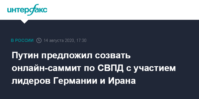 Москва. 14 августа. INTERFAX.RU - Президент РФ Владимир Путин предлагает созвать онлайн-саммит "пятерки" постоянных членов Совета Безопасности ООН с участием руководителей ФРГ и Ирана для обсуждения Совместного всеобъемлющего плана действий (СВПД) по иранской ядерной сделке.