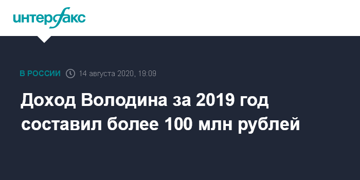Москва. 14 августа. INTERFAX.RU - Спикер Госдумы Вячеслав Володин отчитался о своих доходах за 2019 год: он заработал более 100 млн 290 тыс. рублей, что на 29 млн рублей больше, чем в 2018 году. Сведения опубликованы на сайте Думы.