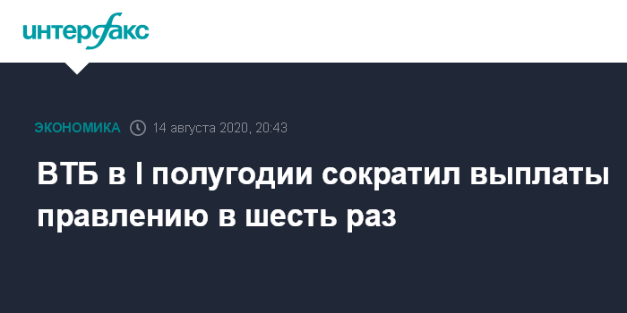 Москва. 14 августа. INTERFAX.RU - ВТБ в первом полугодии 2020 года сократил выплаты членам правления в 6 раз по сравнению с аналогичным периодом прошлого года, до 282,1 млн рублей с 1,73 млрд рублей, свидетельствует ежеквартальный отчет банка по ценным бумагам.