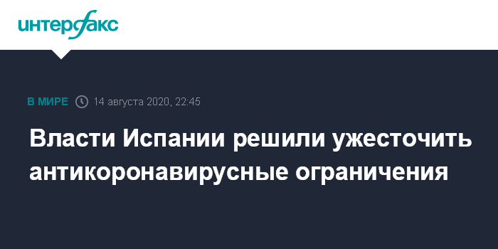 Москва. 14 августа. INTERFAX.RU - Власти Испании в пятницу объявили о введении ряда ограничительных мер из-за продолжающегося роста числа заболевших коронавирусом, сообщают европейские СМИ.