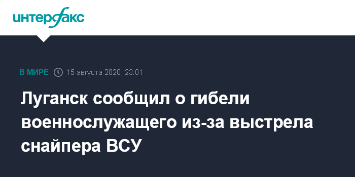 "Сегодня, 15 августа в 19:30 вооруженные формирования Украины вероломно открыли прицельный снайперский огонь на направлении н.п. Луганское - н.п. Логвиново по позициям Народной милиции Луганской Народной Республики, в результате чего один военнослужащий НМ ЛНР получил ранение не совместимые с жизнью", - говорится в сообщении.