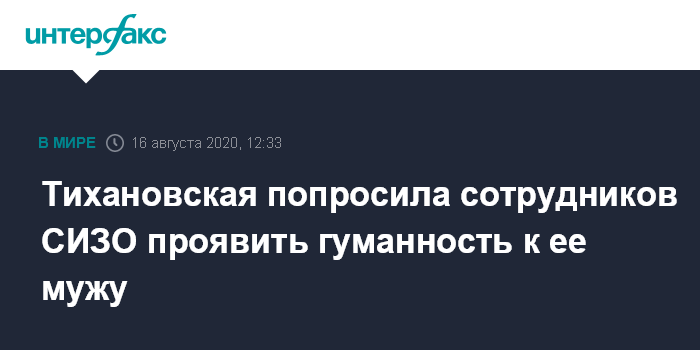 Москва. 16 августа. INTERFAX.RU - Кандидат в президенты Белоруссии Светлана Тихановская попросила сотрудников СИЗО, в котором содержится ее муж Сергей Тихановский, действовать в рамках закона и проявить к нему гуманность.