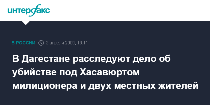Москва. 3 апреля. INTERFAX.RU - Следственные органы Дагестана возбудили уголовное дело по факту убийства милиционера и двух местных жителей, тела которых были обнаружены в четверг в лесном массиве Хасавюртовского района, сообщили в СКП РФ.