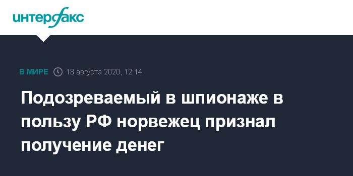 Москва. 18 августа. INTERFAX.RU - Норвежский подданный, задержанный ранее в августе по подозрению в передаче информации российской разведке, признал факт получения денег, сообщает во вторник агентство Associated Press.