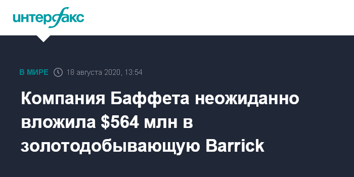 Москва. 18 августа. INTERFAX.RU - Инвестиционная компания миллиардера Уоррена Баффета Berkshire Hathaway во II квартале 2020 года инвестировала около $564 млн в канадского производителя золота Barrick Gold Corp., говорится в документе на сайте Комиссии по ценным бумагам и биржам (SEC) США.