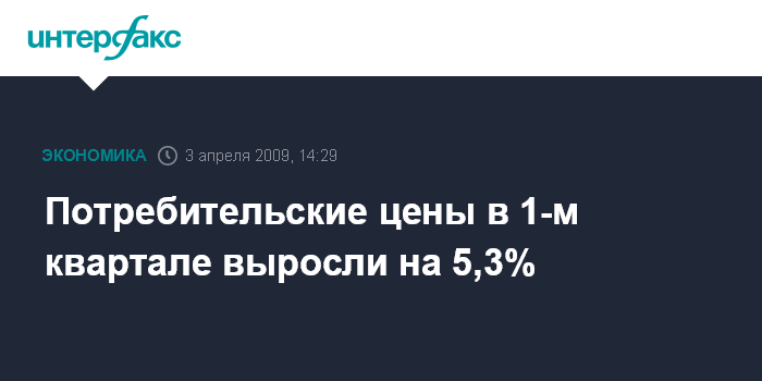 Москва. 3 апреля. INTERFAX.RU - Инфляция за первый квартал 2009 года, по предварительным данным, составила 5,3%. Об этом сообщил председатель Банка России Сергей Игнатьев, выступая на съезде Ассоциации российских банков. В прошлом году потребительские цены за тот же период выросли на 4,8%.