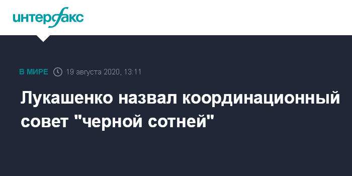 Москва. 19 августа. INTERFAX.RU - Президент Белоруссии Александр Лукашенко назвал незаконным координационный совет оппозиции, созданный для организации трансфера власти. Он назвал совет "черной сотней", передает "БелТА".