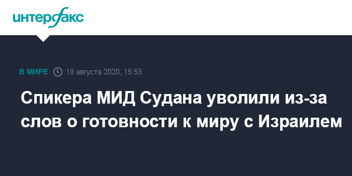 Москва. 19 августа. INTERFAX.RU - Министр иностранных дел Судана Омар Камар ад-Дин сообщил, что уволил представителя своего ведомства за заявление о том, что страна якобы готова вслед за ОАЭ заключить мирное соглашение с Израилем.