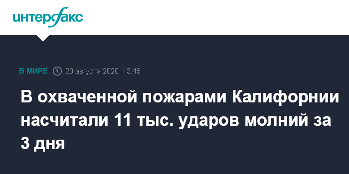 Москва. 20 августа. INTERFAX.RU - Почти 11 тысяч ударов молний привели к ухудшению ситуации в Калифорнии, где бушуют лесные пожары, сообщает ABC News.