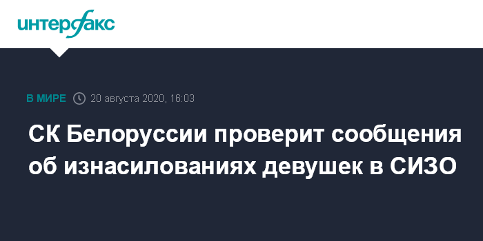 Москва. 20 августа. INTERFAX.RU - Следственный комитет Белоруссии проверяет информацию интернет-ресурсов об изнасилованиях женщин в местах временного содержания, сообщили в ведомстве в четверг.