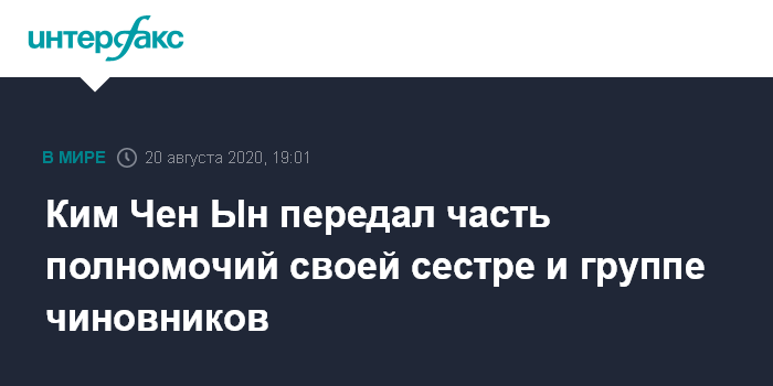 Москва. 20 августа. INTERFAX.RU - Руководитель КНДР Ким Чен Ын передал часть своих полномочий группе чиновников и назначил свою сестру Ким Е Чен фактически вторым лицом в руководстве страны, сообщило в четверг Национальное агентство разведки Южной Кореи.