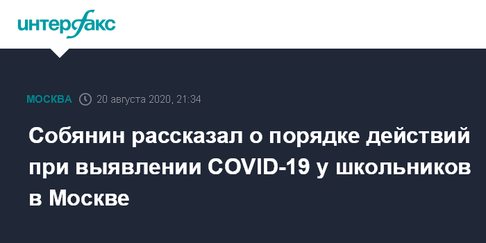 Москва. 20 августа. INTERFAX.RU - При выявлении у учащегося столичной школы подтвержденного случая инфицирования COVID-19 весь его класс переведут на дистанционное обучение в течение двух недель, заявил мэр Москвы Сергей Собянин.