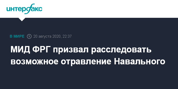 Москва. 20 августа. INTERFAX.RU - Министерство иностранных дел Германии призывает расследовать ситуацию с возможным отравлением российского оппозиционера Алексея Навального.