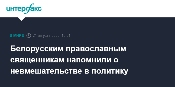 Москва. 21 августа. INTERFAX.RU - Руководство Белорусской православной церкви напомнило духовенству, что они обязывались не участвовать в политике, чтобы не вызывать разделения в обществе.