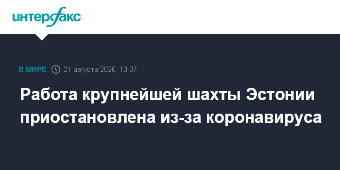 Москва. 21 августа. INTERFAX.RU - В Эстонии из-за вспышки заболеваемости коронавирусом на крупнейшей шахте республики Estonia, входящей в АО Eesti Energia, в пятницу на неделю приостановлена работа, сообщили "Интерфаксу" в службе коммуникации Eesti Energia.