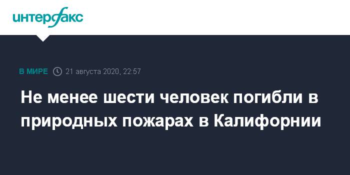Москва. 21 августа. INTERFAX.RU - В американском штате Калифорния продолжаются природные пожары, которые унесли жизни, по меньшей мере, шести человек, сообщило в пятницу агентство Associated Press (AP).