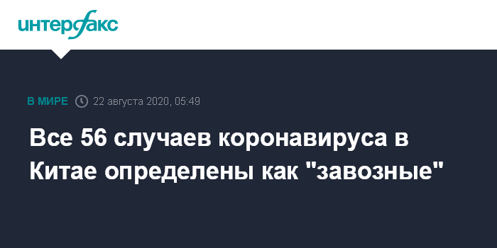 Москва. 22 августа. INTERFAX.RU - За истекшие сутки в Китае выявлено 56 новых инфицированных COVID-19: 22 больных в активной форме и 34 бессимптомных носителя, все "импортированы", сообщил Госкомздрав КНР на своем официальном сайте.