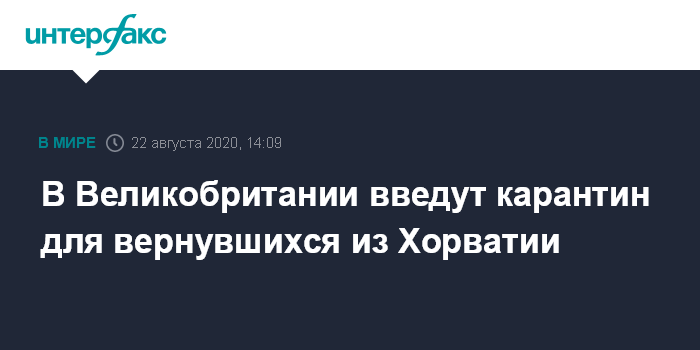 Москва. 22 августа. INTERFAX.RU - Правительство Великобритании приняло решение ввести обязательный карантин на 14 суток для всех возвращающихся из Хорватии, сообщает The Guardian.