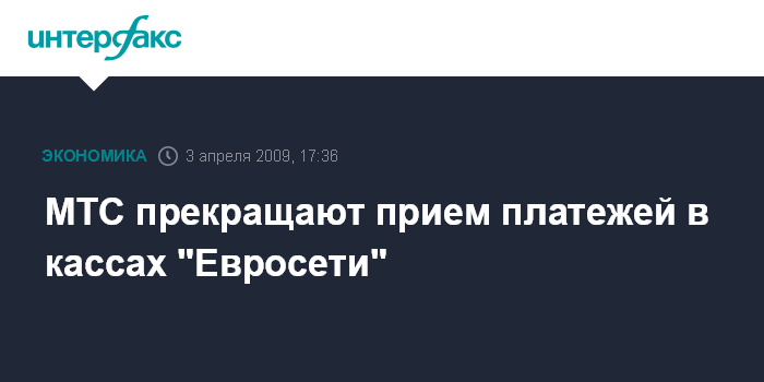 Москва. 3 апреля. INTERFAX.RU - ОАО "Мобильные Телесистемы" (МТС) с 4 апреля прекращает прием платежей, осуществляемых через кассы салонов связи "Евросеть", в связи с тем, что компания не может обеспечить своевременность поступления средств на лицевые счета абонентов в МТС, говорится в сообщении оператора.